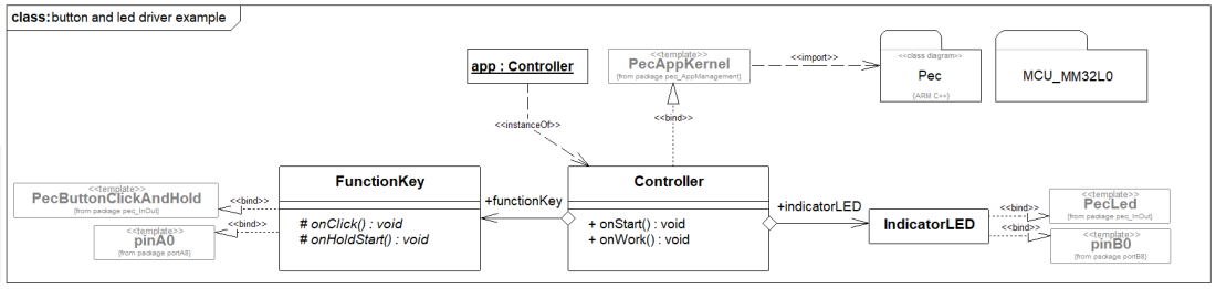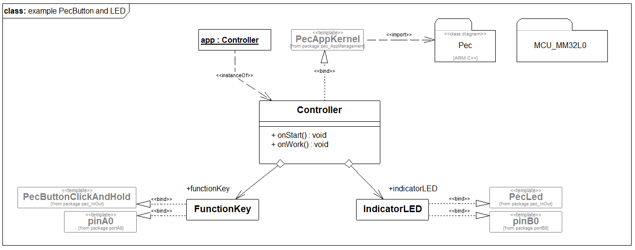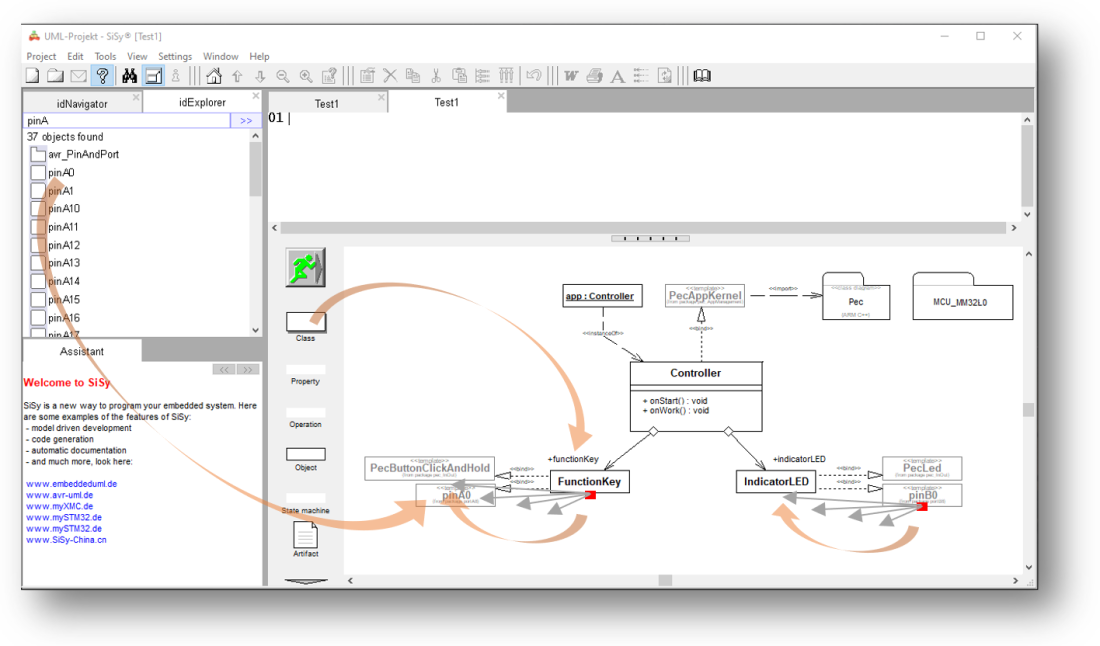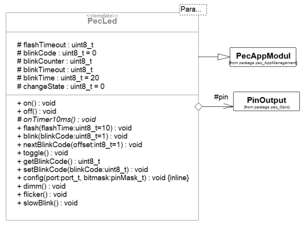 - Bibliotheksbaustein PecLED in das Diagramm ziehen und mit der der Klasse IndicatorLED verbinden