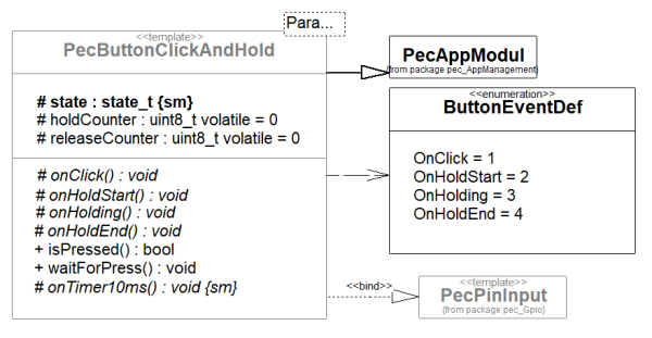 Der Unterschied ist beim Betrachten der Bausteine recht deutlich. Den PecPinInput kann man eigentlich nur konfigurieren und den Status abfragen. Der PecButtonClickAndHold wirkt dagegen viel komplexer. Er hat zwar auch die Merkmale von PecPinInput aber uns fallen vor allem die ist ein-Beziehung zum PecAppModul und die zusätzlichen Verhaltensmerkmale wie zum Beispiel onClick, onHoldStart, isPressed und waitForPress auf.