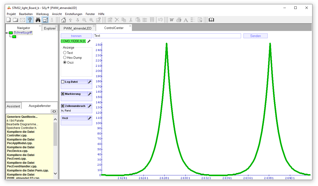 Erweitern Sie zur Übung die Anwendung um eine UART-Verbindung mit 19200 BAUD zum SiSy-ControlCenter. Senden sie die PWM-Werte für die Ansteuerung der LED als 8 Bit Zahlen an das SiSy-ControlCenter. Verfolgen Sie den Signalverlauf in der Oszi-Ansicht des ControlCenters.