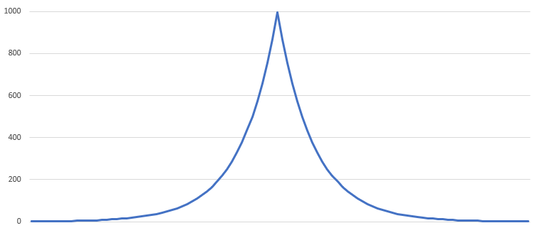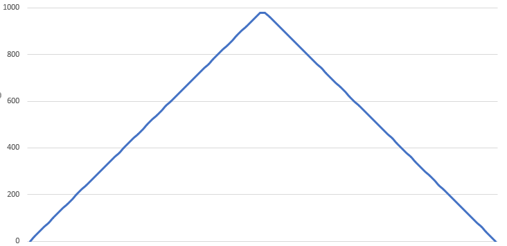 Aber auch dieser Signalverlauf erscheint unserem Auge noch nicht wirklich angenehm. Das liegt daran, dass wir die Helligkeit nicht linear wahrnehmen. Das Auge nimmt kleine Änderungen der Helligkeit im unteren Bereich recht gut wahr. Ab spätestens 50% können wir kaum noch die Änderung der Helligkeit erkennen. Eine Lösung ist es den Signalverlauf nicht linear sondern exponentiell zu gestalten. Das könnte zum Beispiel so aussehen: