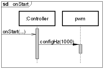Controller::onStart():void// boot sequence after start SysTick // Initialisierung PWM Channel // startet Timer mit gewünschter PWM Frequenz pwm.configHz(1000);