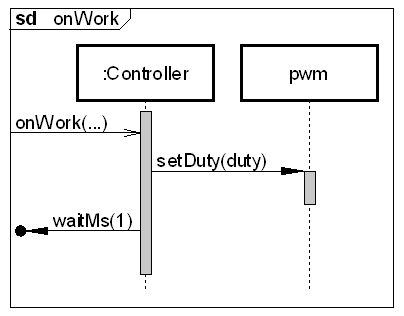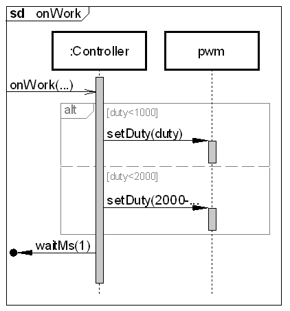 Controller::onWork():voidduty++; if (duty<1000) { pwm.setDuty(duty); } else if (duty<2000) { pwm.setDuty(2000-duty); } else { duty=0; } waitMs(1);
