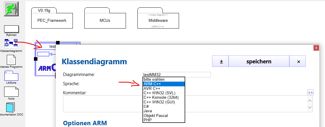 Legen Sie ein neues Klassendiagramm an, indem Sie das entsprechende Element per Drag&Drop aus der Objektbibliothek in das Diagrammfenster ziehen. Achten Sie auf die Einstellung der Zielsprache ARM C + + .