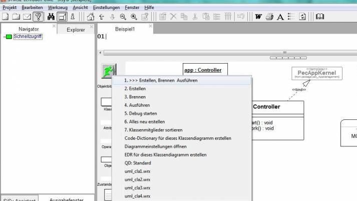 So wie die Anwendung jetzt vor uns liegt tut das Programm nichts, sondern läuft im Leerlauf. Trotzdem wollen wir aus dem Klassendiagramm den Quellcode generieren, diesen übersetzen und auf den Controller übertragen. Das erfolgt über das Aktionsmenü in der Objektbibliothek. Wählen Sie dort den Menüpunkt Erstellen, Brennen Ausführen.