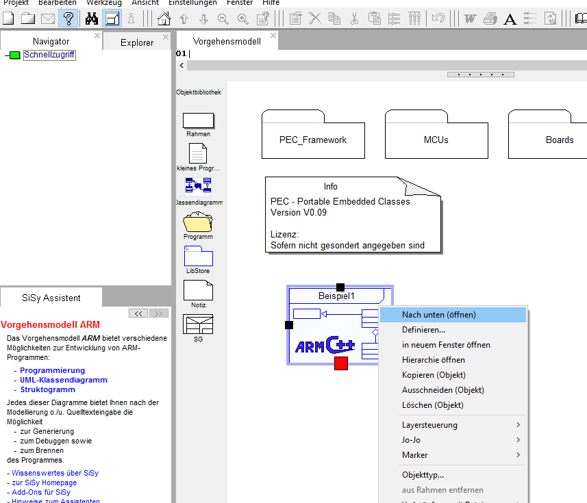 Öffnen Sie das Klassendiagramm, indem Sie auf diesem das Kontextmenü (rechte Maustaste) aktivieren und den Menüpunkt nach unten (öffnen) auswählen. Laden Sie aus dem SiSy LibStore die Diagrammvorlage Application Grundgerüst für PEC Anwendungen (AVR, STM32, … ). Schränken Sie die Vorlagensuche ggf. mit dem Suchbegriff PEC ein.