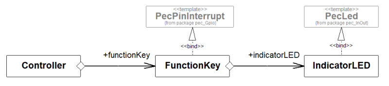 Neu an diesem Entwurf ist, dass die Klasse IndicatorLED nicht in den Controller sondern an die Klasse FunctionKey aggregiert wurde. Damit wurde eine Struktur aufgebaut bei der die Klasse FunktionKey die Klasse IndicatorLED sozusagen in sich versteckt. Sonst hatten wir Systembausteine immer an den Controller gehängt. Die neue Lösung hat den Vorteil, dass beim ansprechen der LED nicht der Pfad über die Instanz des Controllers gegangen werden muss. Da die Klasse FunctionKey jetzt der Eigentümer der IndicatorLED ist kann diese ohne Einschränkungen direkt benutzt werden. Das Macht auch Sinn. Kein anderer Baustein in dieser Anwendung benutzt die IndicatorLED. FunctionKey und IndicatorLED bilden jetzt eine zusammengesetzte Einheit die vom Controller als ein Baustein benutzt wird. Zusammengesetzte Systembausteine nennt man Systemkomponente.