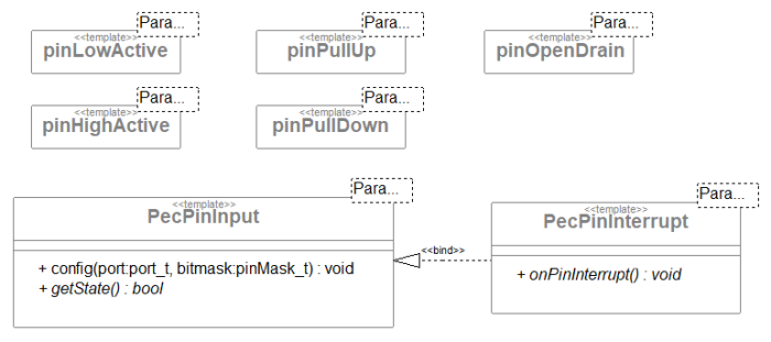 Schaut man sich diesen Baustein näher an ist Festzustellen, dass PecPinInterrupt alle Eigenschaften von PecPinInput besitzt und wie dieser zum beispiel mit pinPullUp und pinLowActive kombiniert werden kann. Diese Optionen sind für die Taster auf dem myMM32 Board light gut geeignet da diese beim Betätigen gegen Masse schließen.