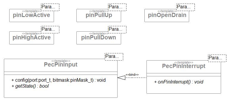 Schaut man sich diesen Baustein näher an ist Festzustellen, dass PecPinInterrupt alle Eigenschaften von PecPinInput besitzt und wie dieser zum beispiel mit pinPullUp und pinLowActive kombiniert werden kann. Diese Optionen sind für die Taster auf dem myMM32 Board light gut geeignet da diese beim Betätigen gegen Masse schließen.