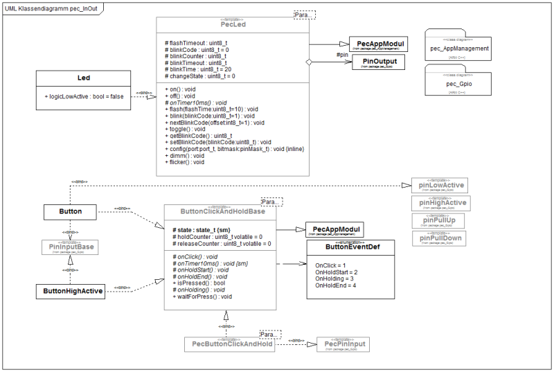 template PecLed{void on();void off();void flash();void blink();void nextBlinkCode();void toggle();uint8_t getBlinkCode();void setBlinkCode();void config();void dimm();void flicker();void slowBlink();}:PecAppModul; template PecButtonClickAndHold{bool isPressed();void waitForPress();virtual onClick();virtual onHoldStart();virtual onHolding();virtual onHoldEnd();}:PecAppModul; template PecPinOutputTimed{void on();void off();void toggle();void pulse();bool isBusy();void onTimer();void pulse();void halt();}:PecAppModul; template PecButton{bool isPressed();virtual onBuutonDown();virtual onButtonUp();}:PecAppModul;
