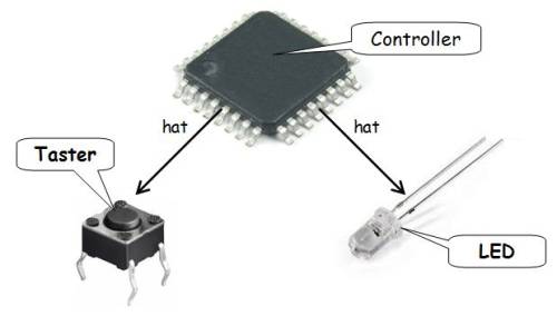 Der Name, welchen wir für ein Ding benutzen, bezeichnet meist nicht nur das einzelne Ding, sondern eine Menge (Gruppe) gleichartiger Dinge. Nehmen wir zum Beispiel den Taster. Davon haben wir auf unserem Experimentierboard schon mal zwei Stück. Um diese zu unterscheiden, geben wir jedem noch einen individuellen Namen, nämlich Taster-1 und Taster-2. Taster steht also als Begriff für alle Schalter mit den entsprechenden gleichen Eigenschaften. Der Fachmann bezeichnet so etwas als Kategorie oder auch als Klasse. Die beiden Objekte Taster-1 und Taster-2 sind Bausteine unseres Systems und gehören zur Klasse (Gruppe) der Taster. Unser oberschlauer Fachmann bezeichnet diese beiden konkreten Objekte auch gern als Instanzen der Klasse Taster. Übrigens kennen wir diese Problematik schon aus der klassischen Programmierung in Form von Typen und Variablen. Klassen sind die Typen und die Objekte so etwas wie die Variablen.