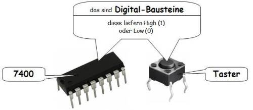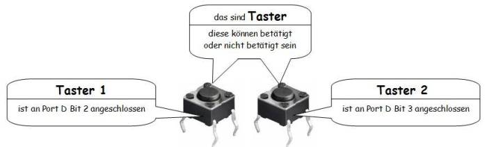 Taster haben mit DIP-Schaltern und Bausteinen der 74er Reihe etwas gemeinsam, sie liefern digitale Signale. Wesentliche Aspekte der Programmierung für Ein- und Ausgaben sind bei all diesen Bausteinen gleich. In der objektorientierten Systementwicklung ist man bestrebt, gemeinsame Merkmale (Attribute und Operationen) nur einmal zu programmieren, um Arbeitsaufwand zu sparen. Das einmal programmierte Merkmal soll aber in allen Bausteinen wiederverwendet werden. Dazu benutzt man den Mechanismus der Vererbung. Das bedeutet, man muss eine allgemeingültige Basisklasse schaffen und dort die gemeinsamen Merkmale programmieren. Das könnte für die oben genannten Bausteine zum Beispiel die Klasse Digital_Baustein sein. Das man für einen Taster noch einen PullUp benötigt ist etwas Spezielles und gehört nicht zu den gemeinsamen Merkmalen. Ein solches spezielles Merkmal wird dann auch nicht in der Basisklasse Digital_Baustein sondern in einer speziellen Klasse, die zum Beispiel eben genau Taster oder wer es denglisch mag PushButton heißen könnte, programmiert. Jedoch die Masse an Merkmalen erbt der Taster von seiner Basisklasse. Diese spezialisierten Klassen nennt der Fachmann auch Ableitungen. Umgangssprachlich lässt sich Vererbung mit „ist ein/ist eine“ ausdrücken.