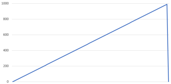 Aber auch dieser Signalverlauf erscheint unserem Auge noch nicht wirklich angenehm. Das liegt daran, dass wir die Helligkeit nicht linear wahrnehmen. Das Auge nimmt kleine Änderungen der Helligkeit im unteren Bereich recht gut wahr. Ab spätestens 50% können wir kaum noch die Änderung der Helligkeit erkennen. Eine Lösung ist es den Signalverlauf nicht linear sondern exponentiell zu gestalten. Das könnte zum Beispiel so aussehen: