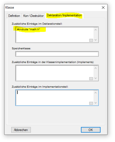 Mit der Formel POTENZ(X,Y) kann man in Excel den gewünschten Signalverlauf in 1000 Schritten gut experimentell ermitteln. Man kommt in etwa zu dem Ergebnis POTENZ(1,00693;Step). Die entsprechende C/C++ Funktion ist pow(x,y) und findet sich in der #include „math.h“. Dazu muss ein entsprechender Eintrag in der Klasse Controller vorgenommen werden. Selektieren Sie die Klasse Controller und wählen im Kontextmenü (rechte Maustaste) den Menüpunkt Definieren…. Im Dialog Deklarationen/Implementation ergänzen sie bitte folgende Zeile: