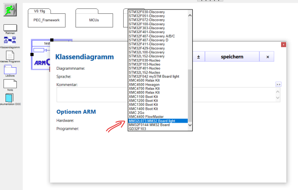 Legen Sie ein neues Klassendiagramm an, indem Sie das entsprechende Element per Drag&Drop aus der Objektbibliothek in das Diagrammfenster ziehen. Achten Sie auf die Einstellung der Zielsprache ARM C + + .