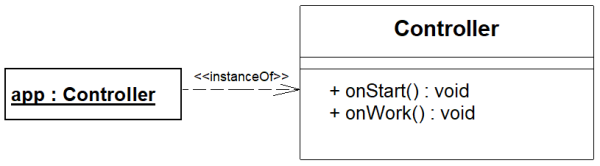 Im Zentrum steht der Systembaustein Controller. OK, das macht irgendwie Sinn. Wir wollen ja einen Mikrocontroller programmieren. Der Controller hat zwei Verhaltensmerkmale: Er kann gestartet werden onStart() und er kann arbeiten onWork().