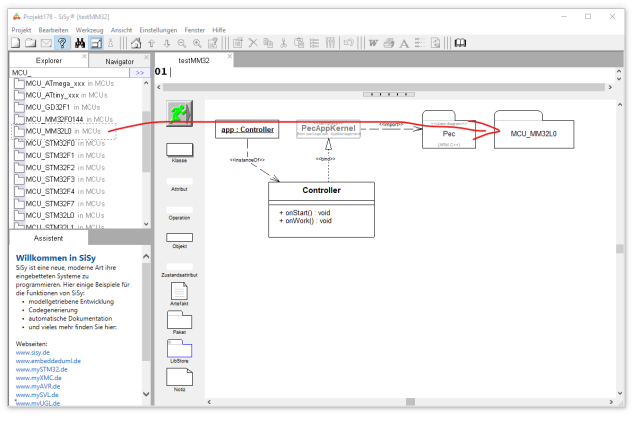 Weisen Sie dem Diagramm das Treiberpaket für den konkreten Controller MCU_MM32L0 zu. Sie finden dieses Paket über den Navigator (UML-Pakete) oder über die Suchfunktion im Explorer.
