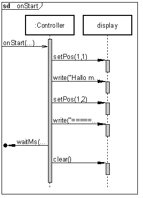 Als ersten vorsichtigen Test geben wir auf Zeile eins und zwei einfache Begrüßungstexte aus die wir nach zwei Sekunden wieder löschen. Notieren sie folgenden Code in der Operation onStart() der Klasse Controller: